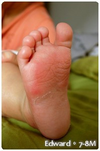 又硬又不透氣的塑膠材質,讓每天小腳腳踢呀踢的Edward小腳皮膚也出了疹子,磨破了皮