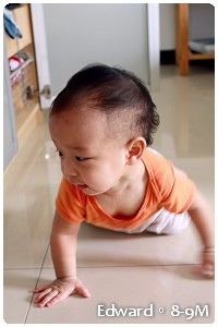 上個月,原本Edward 還只是趴在地板上爬爬,這個月小手與小腳的力量已經有足夠撐起身體,拱起他小小身軀,徹底進入到正常的爬爬模式了,