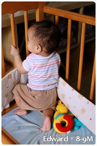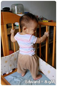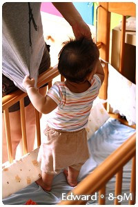 剛開始看他努力的拉著牆圍與小床欄干,試圖要站起來,雖然失敗了很多次,但是Edward 每次有時間就在小床裡練習,