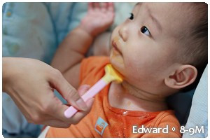 只要一聽到聲音就會轉頭去找聲音的來源,所以每次吃食物泥的時候都非常難餵,尤其是Aaron哥哥在場的時候 (Edward 超超超喜歡哥哥的),