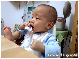 10個月大的Edward 除了喜歡亂咬東西,還好也挺喜歡吃東西。