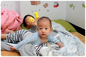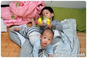 目前看來,居然是Edward 當起小無賴,抓哥哥頭髮,欺負葛格;好脾氣的Aaron 只會ㄚㄚㄚ大叫,媽咪