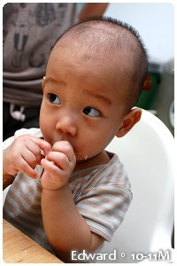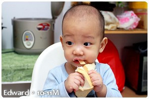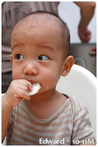 Edward 現在已經可以自己拿著米餅吃的很好囉!不再吃的亂七八糟。