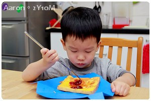 學習著打打蛋,幫吐司均分的沾上蛋液,協助Kellynn 做早餐,或是幫自己的吐司早餐塗上草莓果醬,Aaron 都是樂在其中。