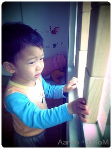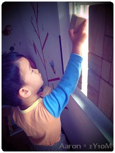 因為Aaron 把積木拿來排在房間裡的窗戶前,拿著大小形狀不同的方塊積木,然後堆疊起來,把小窗口填滿滿的,前排的整齊,就像在玩魔術方塊一樣。