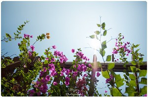 在玩沙子的旁邊,剛好有一幕美麗的畫面,粉色系的九重葛加上藍天,非常的搭