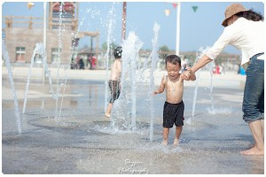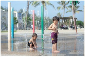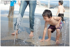 就算被噴水池噴出來的水弄到了臉,還是一樣的開心