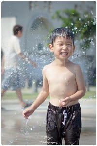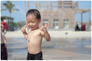 反而,小Aaron三個月的堂弟Rain有點害怕,不太敢玩,只敢在原地玩玩小噴泉