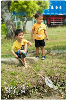 Sky媽就帶著這兩隻小人拿著網子去撈魚