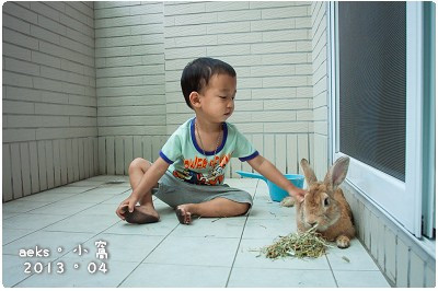 還好,Edward 還蠻有責任感的,會主動拿牧草餵〝Bunny〞,也會在一旁看他玩