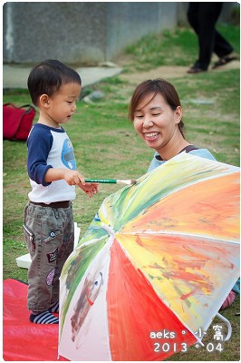Edward 是第一次體驗彩虹老師的課,小人拿起筆刷,在白色的雨傘上胡亂做畫,想怎麼玩就怎麼玩