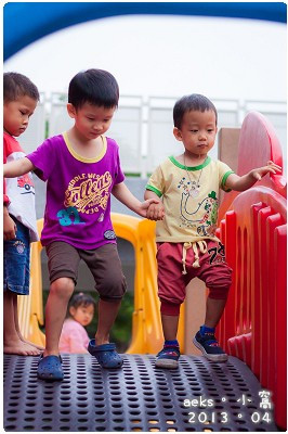 去公園溜滑梯時,有其他不認識的小孩靠近他,Edward 也是咿呀咿呀地呼叫,不准其他人靠近,更別說要跟哥哥們分享玩具了