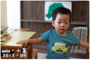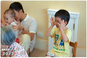 一開始大概只有Aaron 喝ㄋㄟㄋㄟ那約5分鐘左右的時間,Aaron 還願意邊喝邊聽,心情好時就會來個"指指點點";