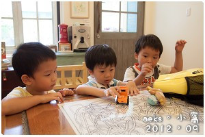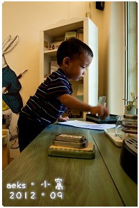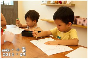 Edward有時候也會來湊熱鬧,自己爬上椅子,學哥哥塗塗鴨,蓋印章。
