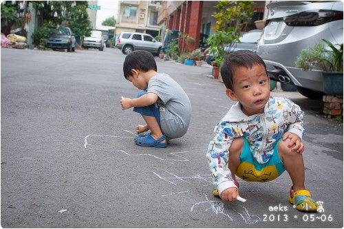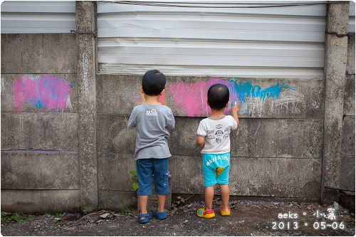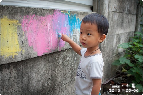 Sky媽家前面的馬路沒什麼車,又有石灰牆,正好是讓兩個小童們體驗粉筆的好所在