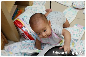 手腳愈來愈靈活的Edward,四處爬,四處搗蛋,翻箱搗櫃把玩具、尿布弄的亂七八糟,到處都是