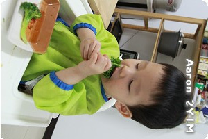 Aaron 一個人亳不客氣的嗑掉吃了一大朵、一整盤的花椰菜。