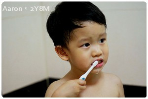 - 把拔和馬麻陪著小人兒一起刷牙,也可以讓Aaron 邊看邊學。 (以身作則咩~)