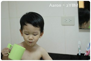 所以每晚一定要讓Aaron 自己擠牙膏,刷幾下牙齒,然後再由把拔馬麻幫忙完成刷牙的動作,最後要Aaron 自己把漱口杯的水水咕嚕咕嚕的一口口"ㄆㄧˋ掉"。