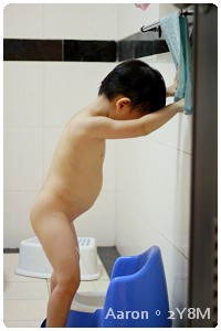 睡前的Aaron 已經會習慣性地先到自己的"便便桶"尿尿。
