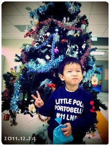 一看是糖果包,Aaron 整個人換上了滿足的笑臉拿著糖果包才願意站在聖誕樹前讓我拍張照