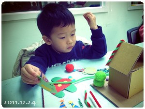 自從沒上幼稚園後,Aaron 就沒做過這麼"大型"的勞作有些遲到的母子兩人,能"搶"到的材料有限