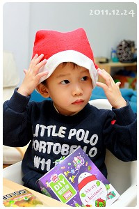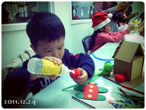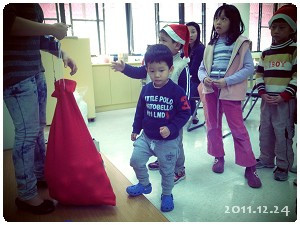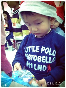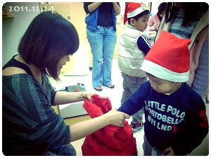 做完了勞做,『聖誕小老師』還發禮物小朋友Aaron 一聽到Key Word 『發禮物』馬上就衝上台,根本還沒聽完老師說要帶著紅色小帽子才可以來... 又跑回來拿帽子