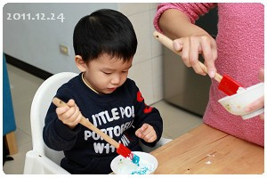 Aaron 看到白白的粉末,加入水就變成了不同的顏色,新奇不已,還以為媽咪有了"魔法"呢小人兒開心的玩起攪拌攪拌,小小人兒卻已經在一旁啃完他所有的餅乾