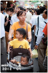 那麼多人,都不趕讓小人兒下來走走,只能讓Edward坐推車,Aaron哥哥則站在推車後方的踏板上,推著他們逛老街