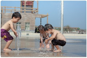 玩完沙子,Skyj媽就帶著三隻小豬(二白一黑,最黑的當然就是Edward嚕) 到旁邊的噴水戲水區玩水囉!