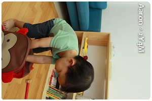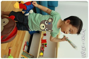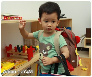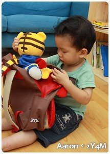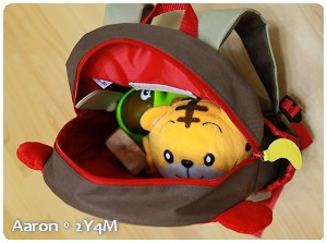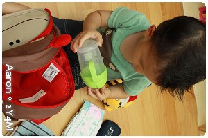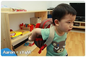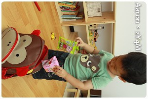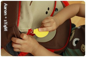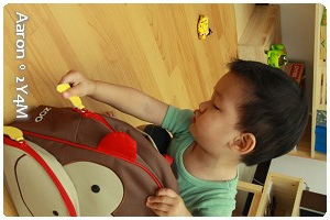 有了小猴子背包之後,就開始訓練2Y4M 的Aaron,在每次出門的時候,把自己需要用到的東西放到背包裡。