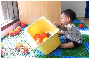 1Y6M的Edward,喜歡把玩具丟到一個容器中,這是唯一一個可以讓他坐著安靜玩很久的小遊戲