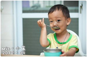 而且吃的非常的棒,一口接一口的吃,湯匙也拿的很穩,食物也很少從碗裡掉出來,比Aaron哥哥學吃飯的時候還要棒,