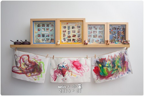 小人們第一次玩水彩的作品,把作品通通吊起來亮乾,其實感覺挺不錯的