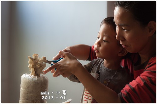 小人兒看到香菇長出來,而且可以採香菇都好開心,Edward 拿著袋子準備採收,也一邊流口水,感覺好像等不及趕緊把香菇給吃掉