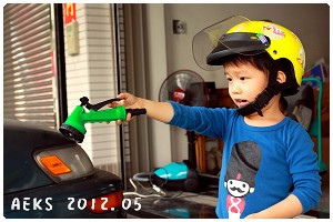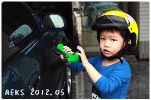 只是,真正要洗車的時候,這小子卻拿起水槍,載起安全帽,在一旁玩了起來。