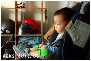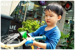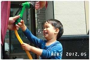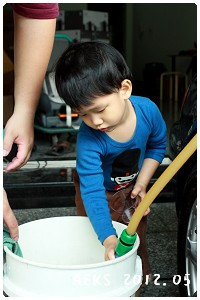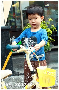 為了不讓Edward也一起下場搗蛋,只好讓他坐在"汽座"上,陪我們一起洗車。