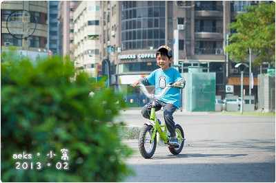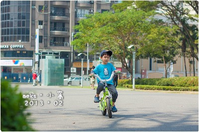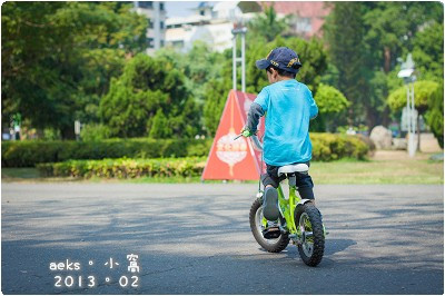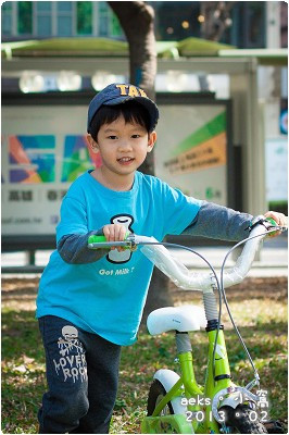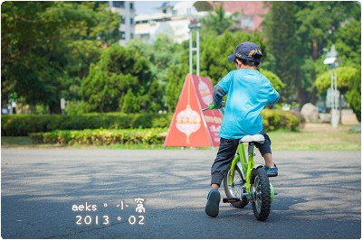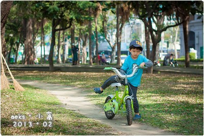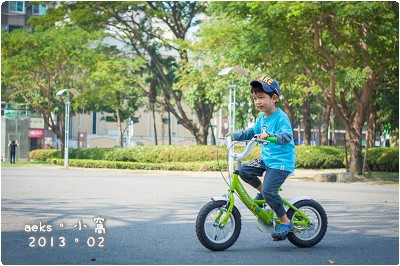 一開始,Aaron 很不習慣,又沒有輔助輪,小人兒很怕跌倒受傷,一直囔嚷著要Skyjon 扶著練騎