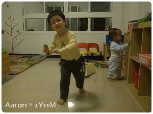 Aaron 雖然是個很愛隨歌起舞的小人,但是先前跳的舞,只能說在床上亂跳亂跑一通,而且跟音樂節奏一點都對不上。