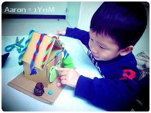 因為Aaron 把積木拿來排在房間裡的窗戶前,拿著大小形狀不同的方塊積木,然後堆疊起來,把小窗口填滿滿的,前排的整齊,就像在玩魔術方塊一樣。