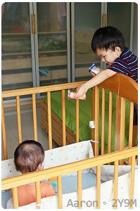 每次只要把Edward 的嬰兒床推到主臥室,Aaron 就喜歡爬進去裡面跟弟弟一起玩湊熱鬧。