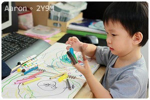 愛畫畫的Aaron,雖然畫出來的圖還是一樣的〝鬼畫符〞,非本人絕對看不懂,但是之前畫的都是線條,現在可以畫不圓的圓形囉!(算有點進步啦!)